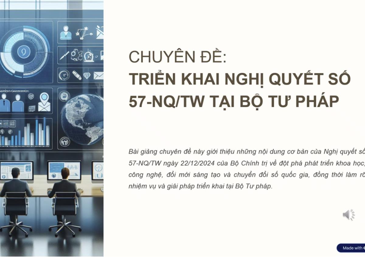 Bộ Tư pháp đã và đang đẩy mạnh triển khai Nghị quyết 57-NQ/TW ngày 22/12/2024 của Bộ Chính trị về đột phá phát triển khoa học, công nghệ, đổi mới sáng tạo và chuyển đổi số quốc gia. Trọng tâm bao gồm thể chế hóa chủ trương, nâng cao chất lượng xây dựng pháp luật, ứng dụng AI và tăng tốc chuyển đổi số trong ngành.