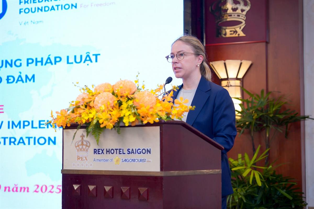 Đại diện Viện FNF Việt Nam, bà Vanessa Steinmetz, cho rằng việc “đối thoại pháp lý” là một nền tảng hợp tác hiệu quả giữa Bộ Tư pháp Việt Nam và Bộ Tư pháp CHLB Đức nhằm thúc đẩy trao đổi kiến thức và kinh nghiệm pháp lý lẫn nhau. Hội thảo sẽ mang đến những kiến thức thực tiễn và những khuyến nghị quý báu, góp phần xây dựng một hệ thống pháp luật hiện đại, minh bạch và hiệu quả hơn.