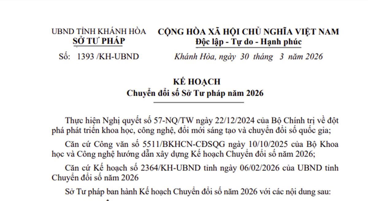 Việc ban hành Kế hoạch này không chỉ thể hiện sự quyết tâm của lãnh đạo Sở Tư pháp tỉnh Khánh Hòa trong việc thực hiện các Nghị quyết của Bộ Chính trị về chuyển đổi số quốc gia mà còn góp phần quan trọng vào việc xây dựng nền hành chính tư pháp hiện đại, minh bạch và vì dân phục vụ.