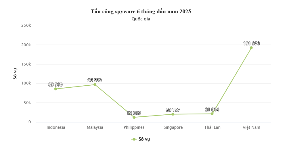Với gần 192.000 vụ tấn công, Việt Nam tiếp tục nằm trong nhóm ba quốc gia ghi nhận hoạt động spyware tăng mạnh nhất Đông Nam Á, chỉ sau Singapore và Malaysia - hai thị trường lần lượt tăng 210,9% và 124,2%. Trung bình mỗi ngày, doanh nghiệp Việt Nam phải đối mặt với hơn 1.520 cuộc tấn công.