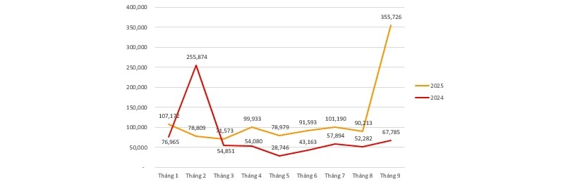 Số lượng các cuộc tấn công DDoS theo tháng trong 3 quý đầu năm 2024, 2025 (Nguồn: Viettel Anti-DdoS)